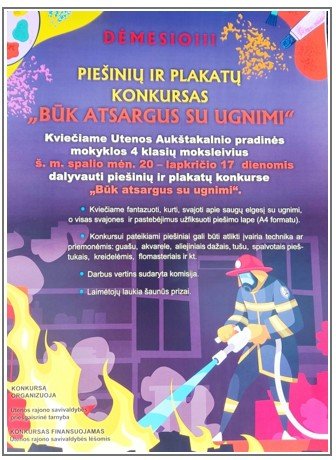 Gruodžio mėn. 18 dieną Utenos Aukštakalnio pradinėje mokykloje 4 klasių moksleiviams įteikti diplomai, padėkos ir prizai visiems dalyvavusiems piešinių ir plakatų piešimo konkurse „Būk atsargus su ugnimi!“. Piešimo konkursui, kuris vyko spalio mėn. 20 – lapkričio 17 dienomis, moksleivius kvietėme fantazuoti, kurti, svajoti apie saugų elgesį su ugnimi, o visas svajones ir pastebėjimus užfiksuoti piešimo lape. Konkursui pateikta net 65 piešiniai.
